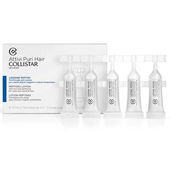 Collistar Peptides Anti-Hair Loss Ampoules are an anti-hair loss and strengthening treatment designed for weak and fragile hair susceptible to temporary hair loss caused by hormonal factors, stress, or seasonal changes. These ampoules contain concentrated peptides combined with plant and mineral active ingredients that stimulate the hair follicle, preventing hair loss and stimulating hair growth. They also nourish the scalp without adding oil. Their lightweight formula leaves no residue. Hair becomes thicker and fuller. For intensive treatment, we recommend applying one ampoule daily for at least 8 weeks. For prevention or maintenance, we recommend applying two ampoules per week. Their formula is vegan, non-comedogenic, and dermatologically tested.