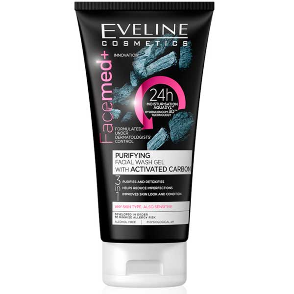 Eveline Facemed+ Purifying Facial Cleansing Gel with Activated Charcoal cleanses and purifies the skin, combating excess sebum, blemishes, and blackheads. We recommend massaging it into damp skin. Rinse thoroughly with water.