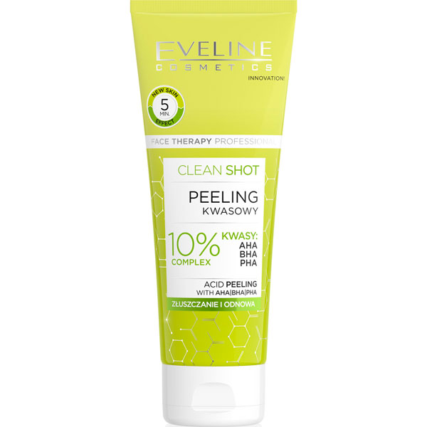 Eveline Clean Shot Acid Peeling 10% is an acid peel specially designed for dull and tired skin thanks to its exclusive 10% complex of AHA, BHA, and PHA acids, including glycolic acid, salicylic acid, and lactobionic acid. The result is regenerated, luminous, hydrated, and soothed skin. We recommend applying it once or twice a week evenly to a clean face, avoiding the eye area and nose. Leave on for 10 minutes and massage in with wet hands. Rinse with warm water. Apply a high sun protection factor (SPF 30 or higher) in the following days.