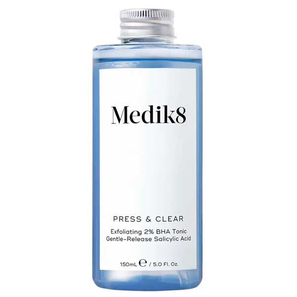 Medik8 Press & Clear is a lotion that repairs and renews sensitive skin prone to imperfections such as pores, uneven tone, blemishes and sebum. Its formula contains 2% Beta-Hydroxy Acid, which decongests and balances the skin, blurring imperfections and lightening the tone. Its pH 5.5 makes it an ideal exfoliant to maintain the balance of the most sensitive skin. Its Tranexamic acid content provides great luminosity to the face, while smoothing the skin and reducing imperfections. Sake and Aloe Vera extracts provide hydration, eliminating any trace of dryness. The result is purified, balanced and visibly radiant skin. We recommend applying 3 or 4 pumps of product onto a cotton pad and gently sliding over clean, dry skin.